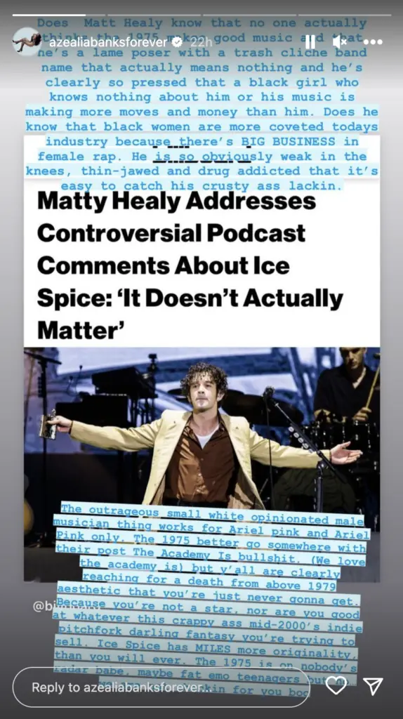 Credit: Instagram"Does Matt Healy know that no one actually thinks The 1975 make good music and that he’s a lame poser with a trash cliche band name that actually means nothing," she wrote on her Instagram Stories, sharing a screenshot of an article about Healy’s Ice Spice remarks.