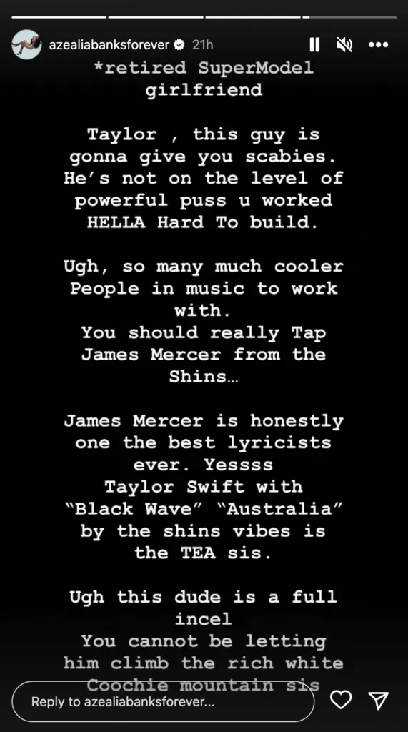 "You should really tap James Mercer from The Shins," she said before adding: "James Mercer is honestly one of the best lyricists ever. Ugh this dude is a full incel. You cannot be letting him climb the rich white Coochie mountain sis."