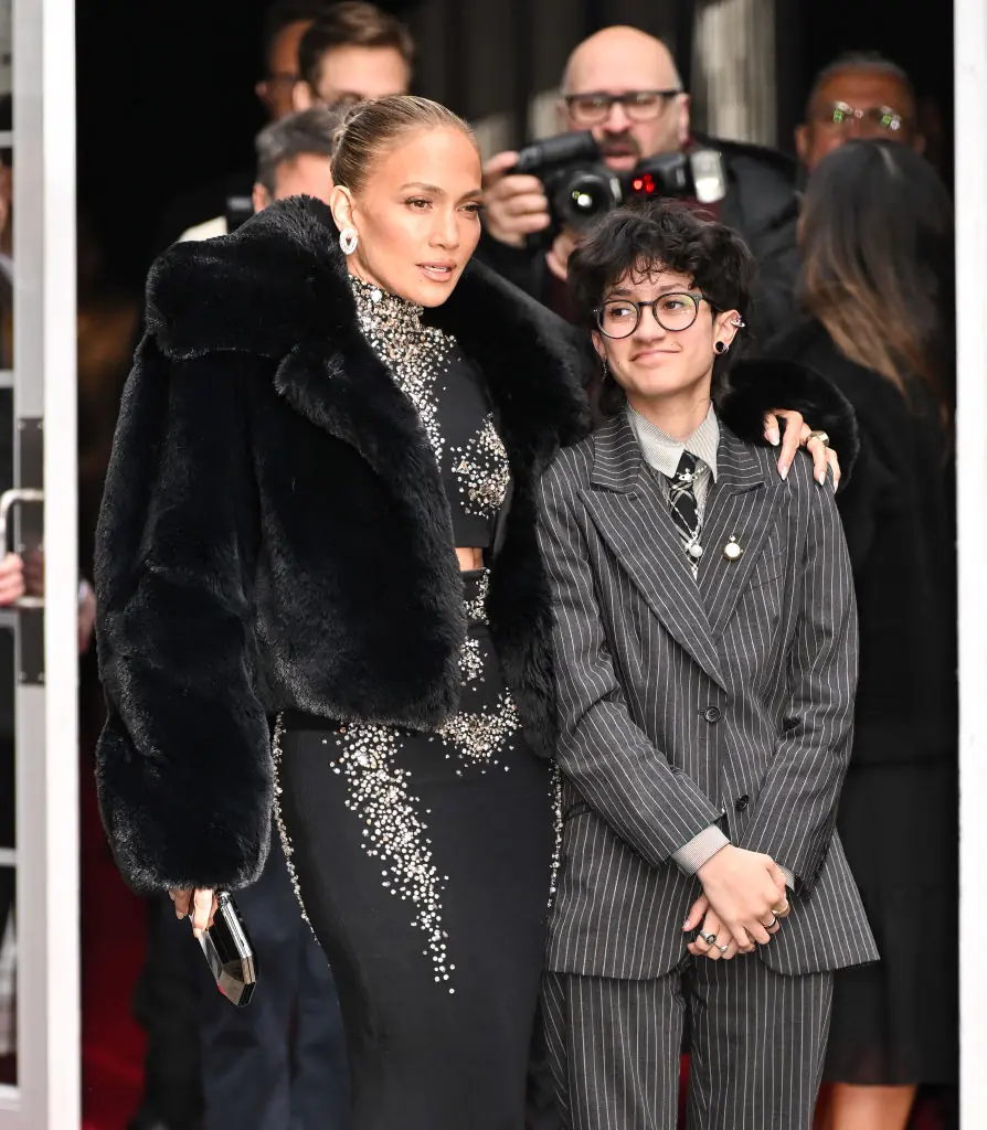 Lopez stunned in a two-piece outfit that showed off her midriff beneath a slightly cropped top. She completed her look with a floor-length skirt, a fur coat, and a chic bun, while Emme opted for a relaxed, fashionable vibe that complemented their mother’s outfit.