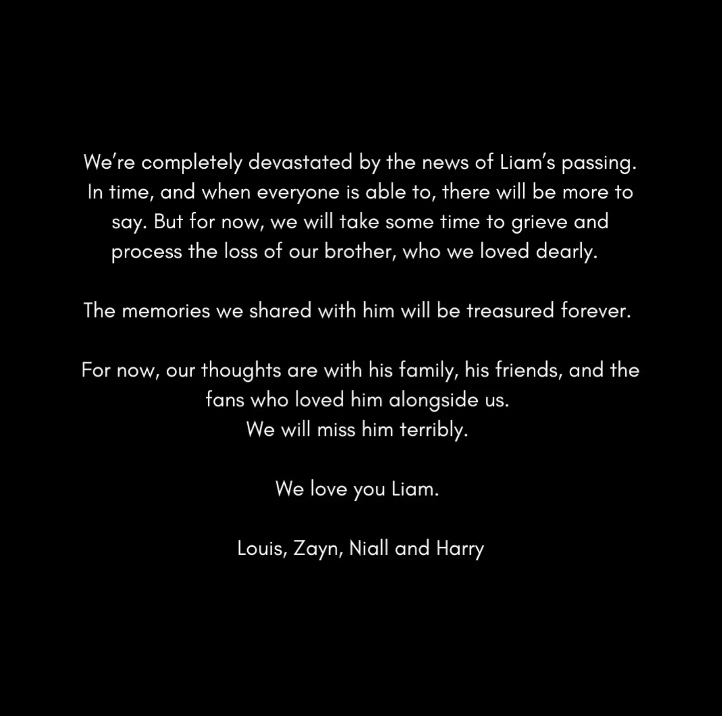 "The memories we shared with him will be treasured forever. For now, our thoughts are with his family, his friends, and the fans who loved him alongside us," the statement continued before signing off: "We will miss him terribly. We love you, Liam. - Louis, Zayn, Niall, and Harry."