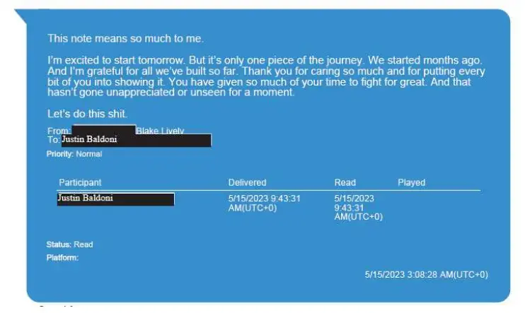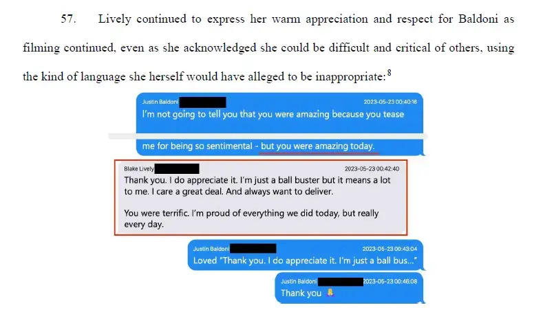 Baldoni also praised Lively after a successful first few days on set, writing on May 23, 2023: "I’m not going to tell you that you were amazing because you tease me for being so sentimental – but you were amazing today."