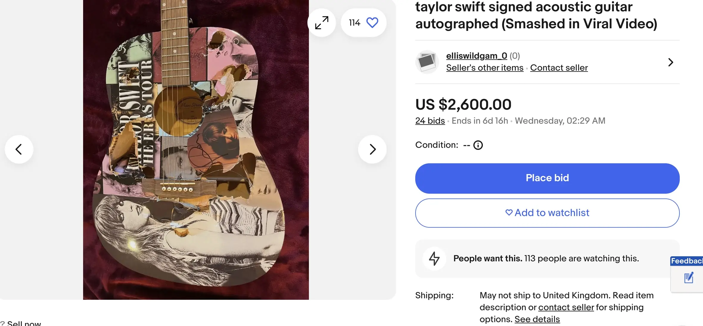 The listing states: "Man bought this signed Taylor Swift Guitar at a charity auction for $4000, then proceeded to smash it with a hammer. The video went viral on multiple platforms worldwide.