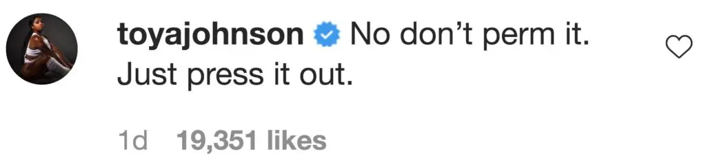 And reality TV star Toya Johnson told Minaj: "No don’t perm it. Just press it out."