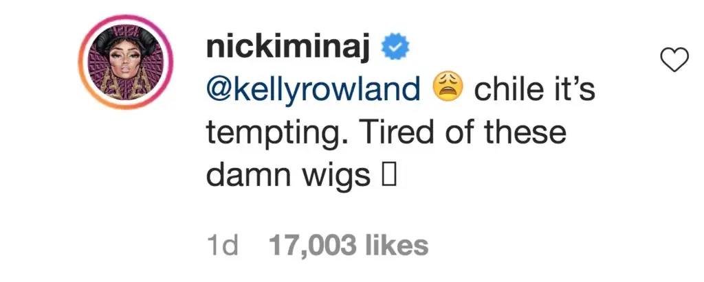 And it seems like Nicki is also sick and tired of covering up her natural hair, as she replied to Rowland saying: "chile it’s tempting. Tired of these damn wigs".