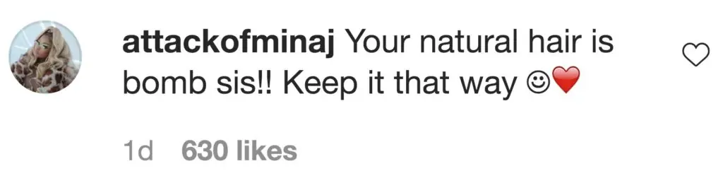 Another Instagram user commented: "Your natural hair is bomb sis!! Keep it that way."