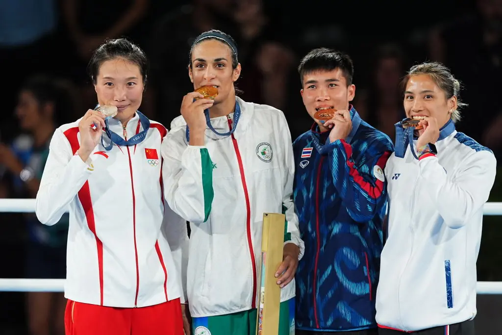 Khelif with silver medalist Yang Liu, and bronze medalists Janjaem Suwannapheng and Chen Nien Chin. Credit: China News Service / Getty