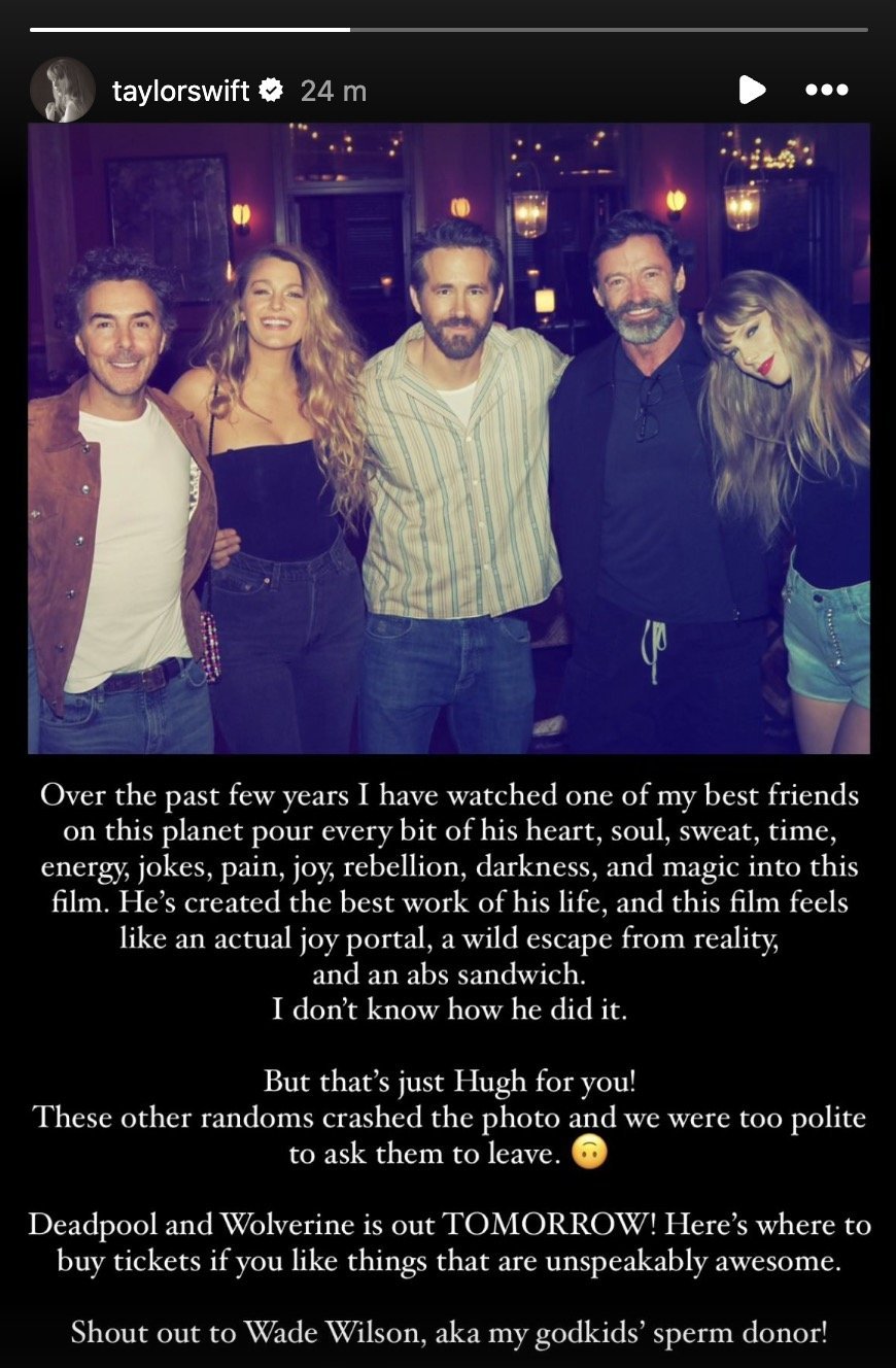 Sharing a photo of her posing with Jackman, Reynolds, Lively and the movie's director, Shawn Levy, Swift penned a heartfelt caption that appeared to be for Reynolds - whose passion for the character of Deadpool and the movies is well-documented.