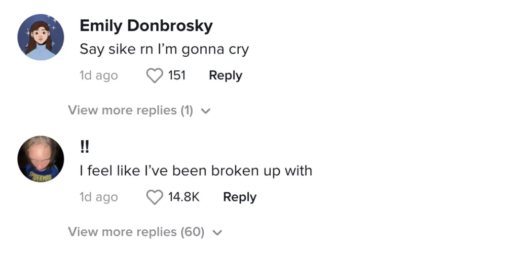 "Say sike rn I'm gonna cry," wrote one user, while another added: "I feel like I've been broken up with."