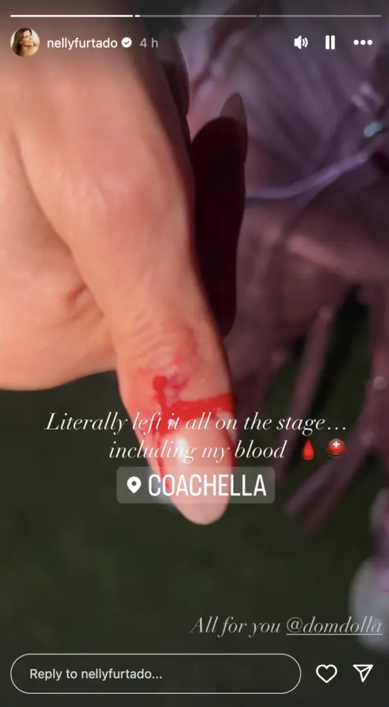 "Literally left it all on the stage... including my blood," she wrote alongside a video of her finger, which was bleeding as a result of the accident.