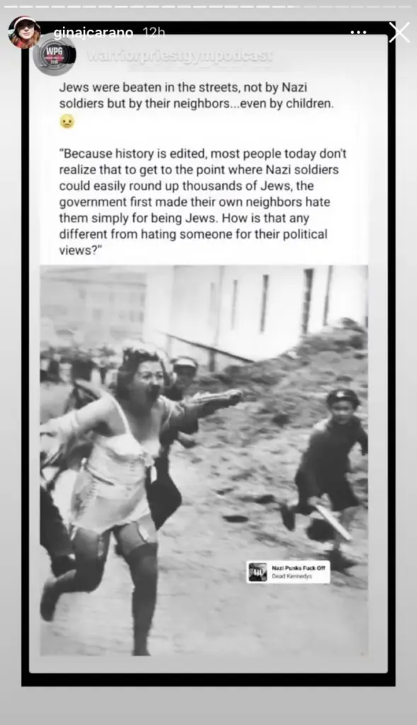 Posting to her official Instagram account in February 2021, Caranos shared a post that read: "Jews here beaten in the streets, not by Nazi soldiers but by their neighbors... even by children. Because history is edited, most people don’t realize that to get to the point where Nazi soldiers could easily round up thousands of Jews, the government first made their own neighbors hate them simply for being Jews.