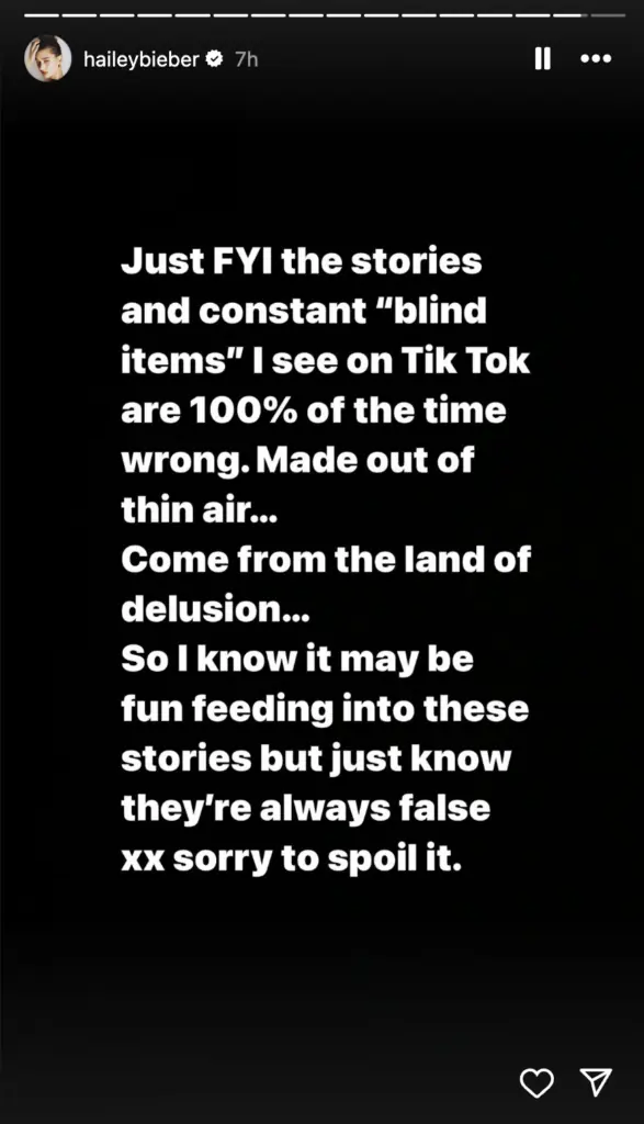 Following Stephen's post, fans were left wondering what his post had been alluding to, but Hailey's recent clapback appears to have shut down any rumors.
