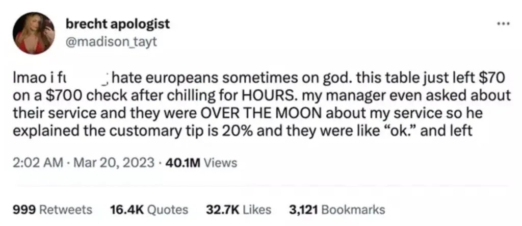 Naturally, this created a wave of Americans standing up for Madison but also invited a number of Europeans to question why she was turning her nose up at a $70 tip.