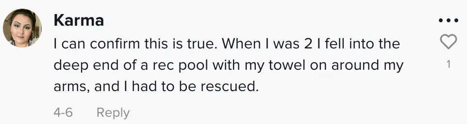 One user wrote: "I can confirm this is true. When I was 2 I fell into the deep end of a rec pool with my towel on around my arms, and I had to be rescued."