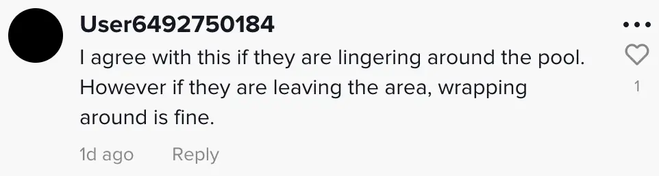 Another person interjected: "Also- if they trip, they can catch themselves before hitting the ground," while a third commented: "I agree with this if they are lingering around the pool," but added: "However if they are leaving the area, wrapping around is fine."