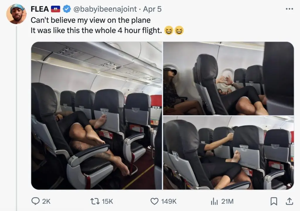 The jaw-dropping incident was captured by X user Flea (@babyibeenajoint), who quickly garnered a whopping 21 million views after sharing photos of his "in-flight show" to the social media platform.