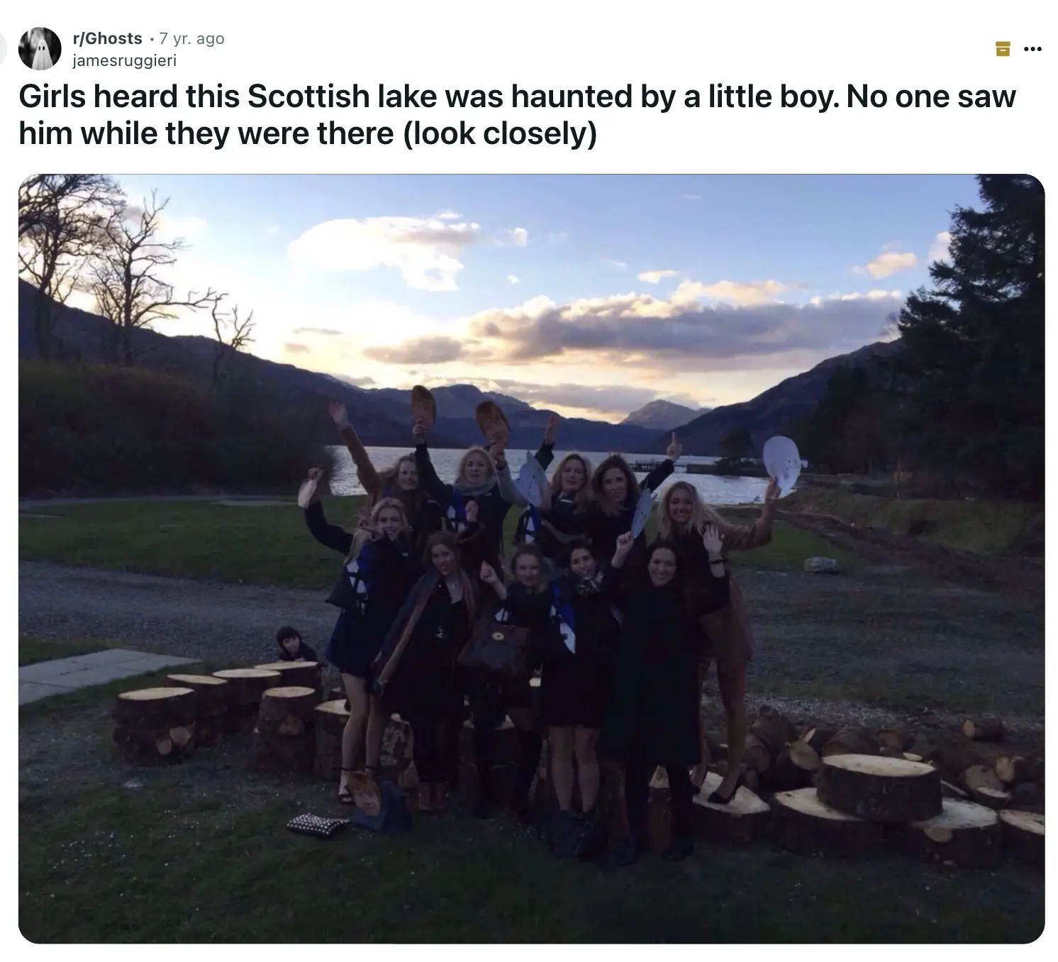 It was reported that the friends researched the property's past after noticing the dark-haired photobomber and uncovered a tragic tale of a child who reportedly drowned in a nearby lake after sleepwalking into it.
