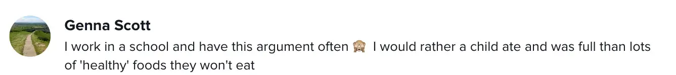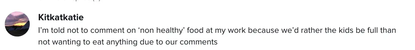 A second person added: "I’m told not to comment on 'non healthy' food at my work because we’d rather the kids be full than not wanting to eat anything due to our comments."