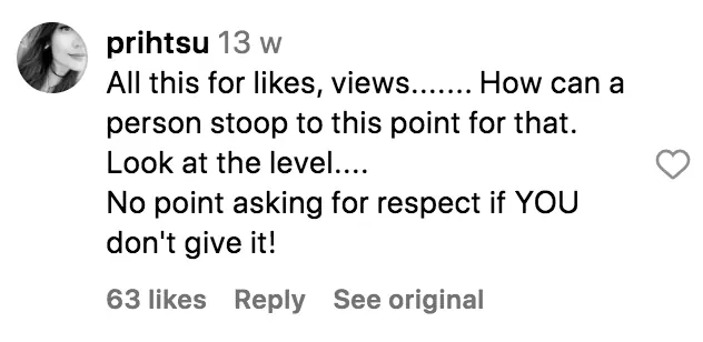 Another person said: "All this for likes, views....... How can a person stoop to this point for that? Look at the level....No point asking for respect if YOU don't give it!"