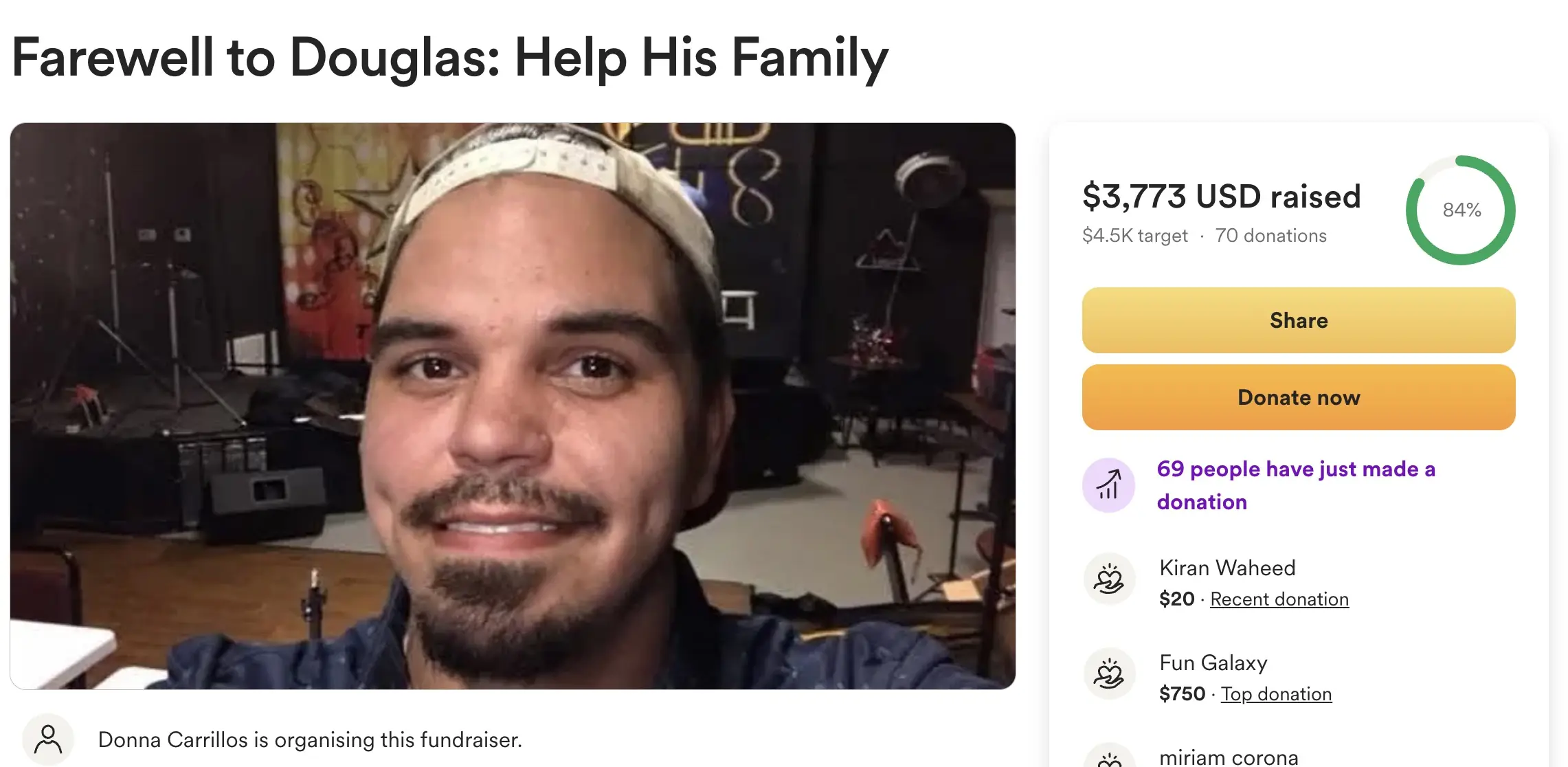 A GoFundMe page has been created to help with funeral expenses, with the goal of raising $4,500 to bring Doug home and give him the farewell he deserves.