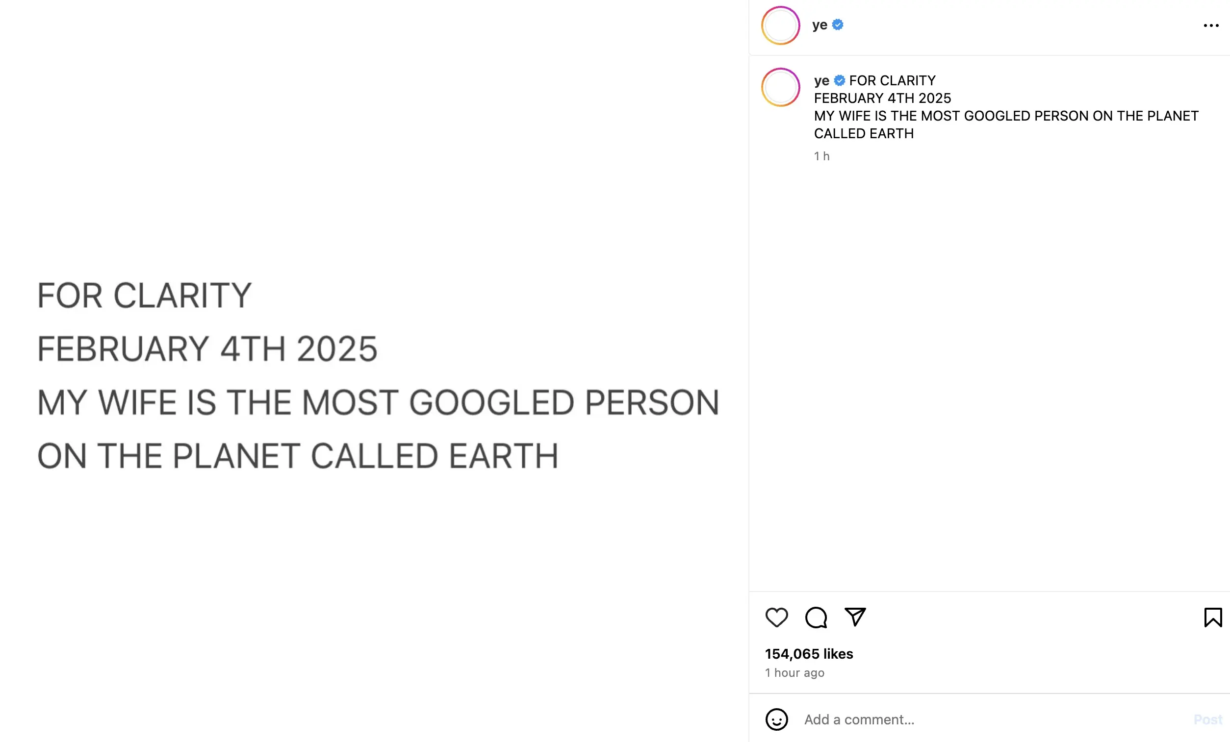 “We beat the Grammies [sic],” he boasted on Instagram. Later, he added, “For clarity, February 4th 2025 my wife is the most Googled person on the planet called Earth.”
