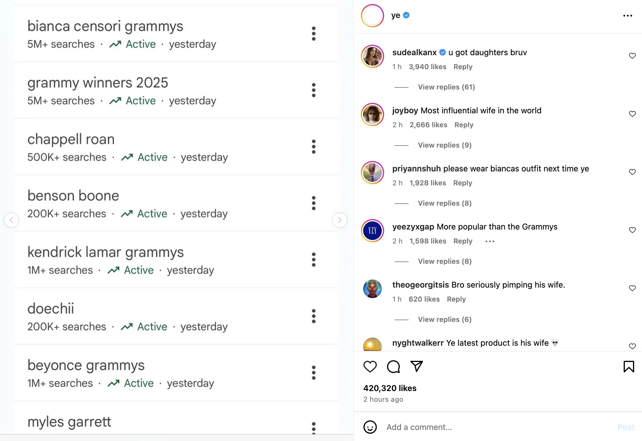 As well as making headlines across the globe, Ye has also shared statistics from Google Trends showing just how many people have been searching for Censori's Grammys look on Google:
