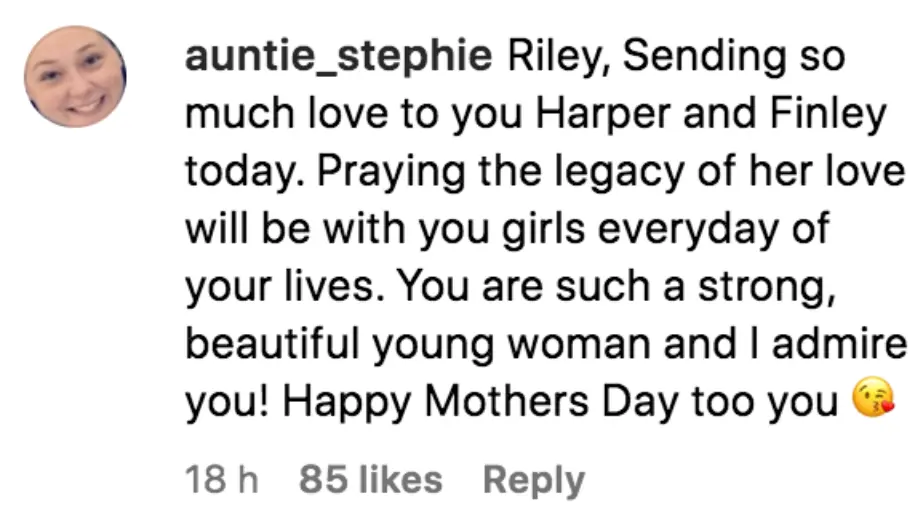 The actress's followers flooded the comment section with words of support. One fan penned: "Riley, Sending so much love to you Harper and Finley today. Praying the legacy of her love will be with you girls every day of your lives. You are such a strong, beautiful young woman and I admire you! Happy Mother's Day too you. [sic]"