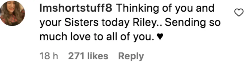 Another user wrote: "Thinking of you and your Sisters today Riley.. Sending so much love to all of you," while a third added: "Your mom is with you and your sisters always Riley. Watching over you with [love]. Sending my thoughts and prayers to you and your family."