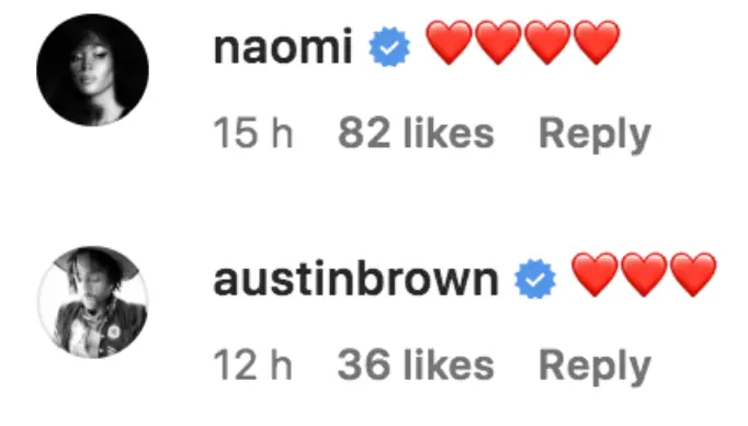 Celebrities like Naomi Campbell and singer Austin Brown replied to the loving tribute with red heart emojis.