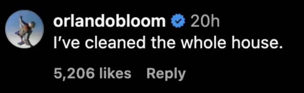 Never one to miss a beat, Bloom cheekily commented on Perry’s latest Instagram post, which featured photos from her podcast appearance, writing: “I’ve cleaned the whole house.” The comment quickly went viral, racking up over 5,000 likes and hundreds of replies from amused fans.