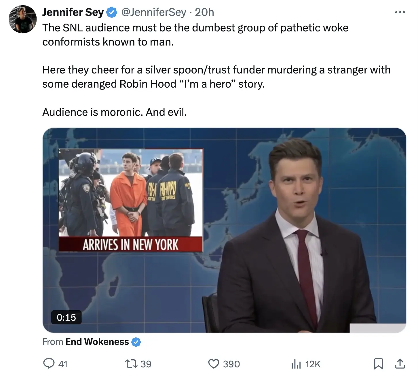Author and business executive Jennifer Sey also condemned the reaction, writing on X: “The SNL audience must be the dumbest group of pathetic woke conformists known to man.