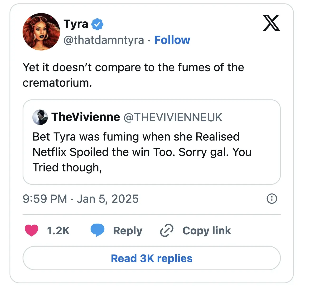 The late drag star's tweet, which was shared in July 2020, read: “Bet Tyra was fuming when she Realised Netflix Spoiled the win Too. Sorry gal. You Tried though."