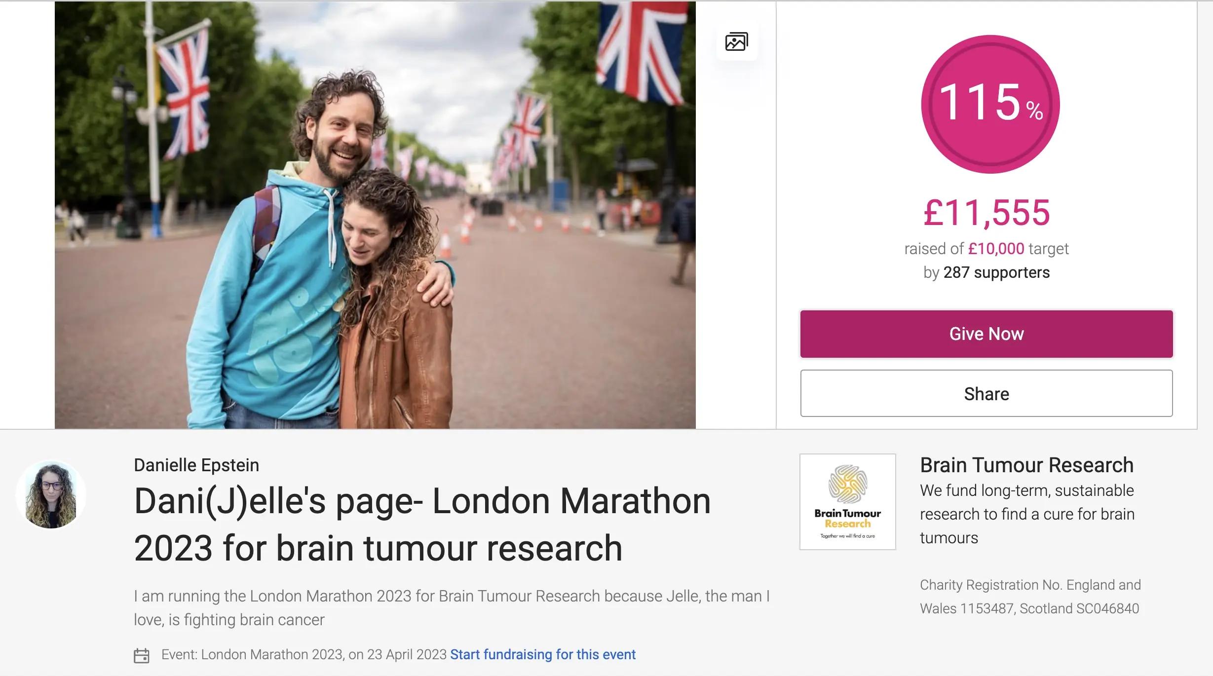 Danielle ran the London Marathon in Jelle's honor and raised over £14,800 ($19,830) of her £10,000 ($12,400) goal on JustGiving for the charity Brain Tumour Research.