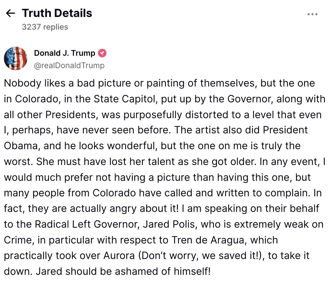 “Nobody likes a bad picture or painting of themselves, but the one in Colorado, in the State Capitol, put up by the Governor, along with all other Presidents, was purposefully distorted to a level that even I, perhaps, have never seen before,” he wrote.
