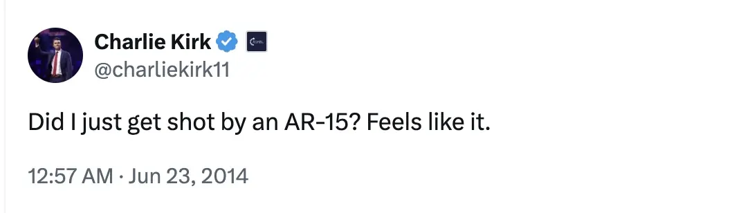 In the post, which was shared on June 23, 2014, Kirk had written: "Did I just get shot by an AR-15? Feels like it."