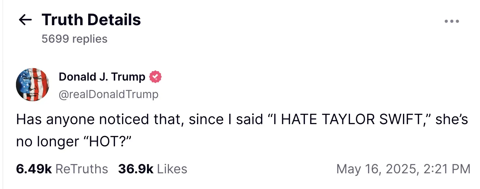 The President of the United States took another bizarre jab at the pop superstar this week, posting yet another bizarre Truth Social post - this time, appearing to attack Swift’s looks.