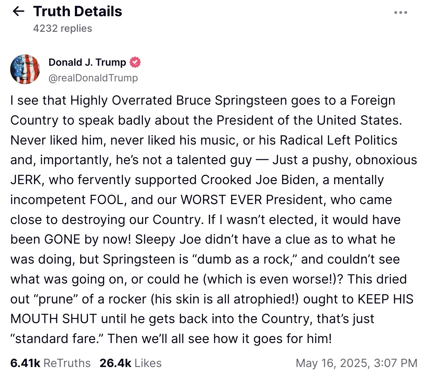 He accused Springsteen of backing “Crooked Joe Biden, a mentally incompetent FOOL,” and claimed the U.S. “would have been GONE by now” if he hadn’t won the election.