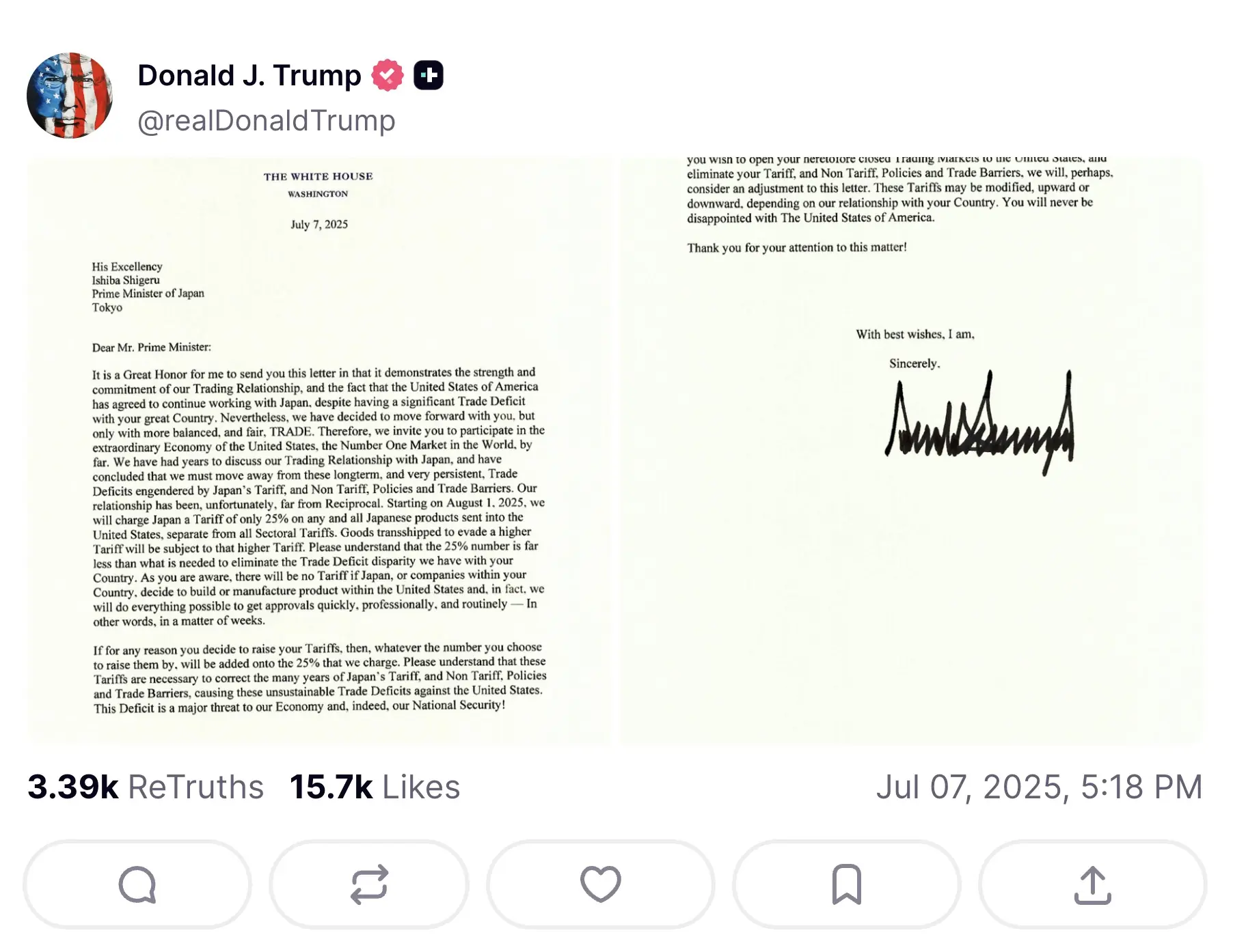 The letter, which the 79-year-old posted to Truth Social on July 7, announced the US would impose 25% tariffs on Japanese goods starting August 1.