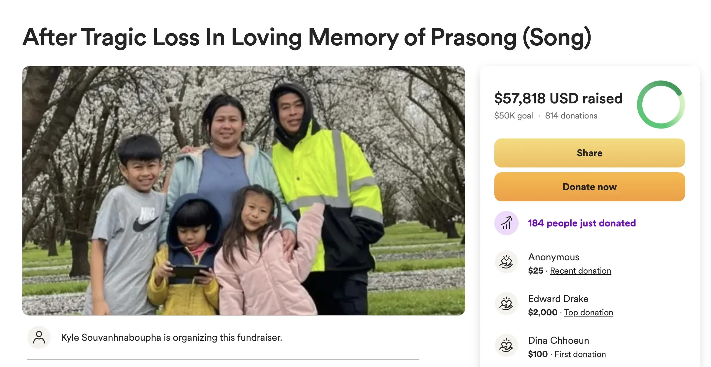 "He was a rock in our lives, raising us with love, laughter, and guidance. Now, we’re suddenly standing in his place, caring for his wife - our aunt - and his three young children," Kyle Souvanhnabouph penned.