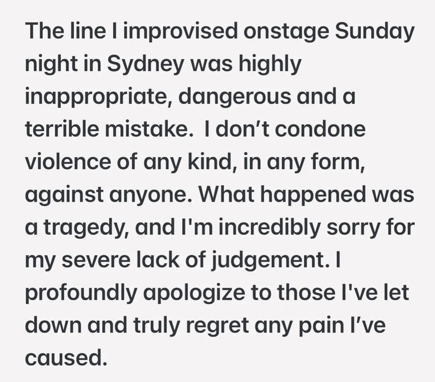 "The line I improvised onstage Sunday night in Sydney was highly inappropriate, dangerous, and a terrible mistake," Gass wrote. "I don’t condone violence of any kind, in any form, against anyone.