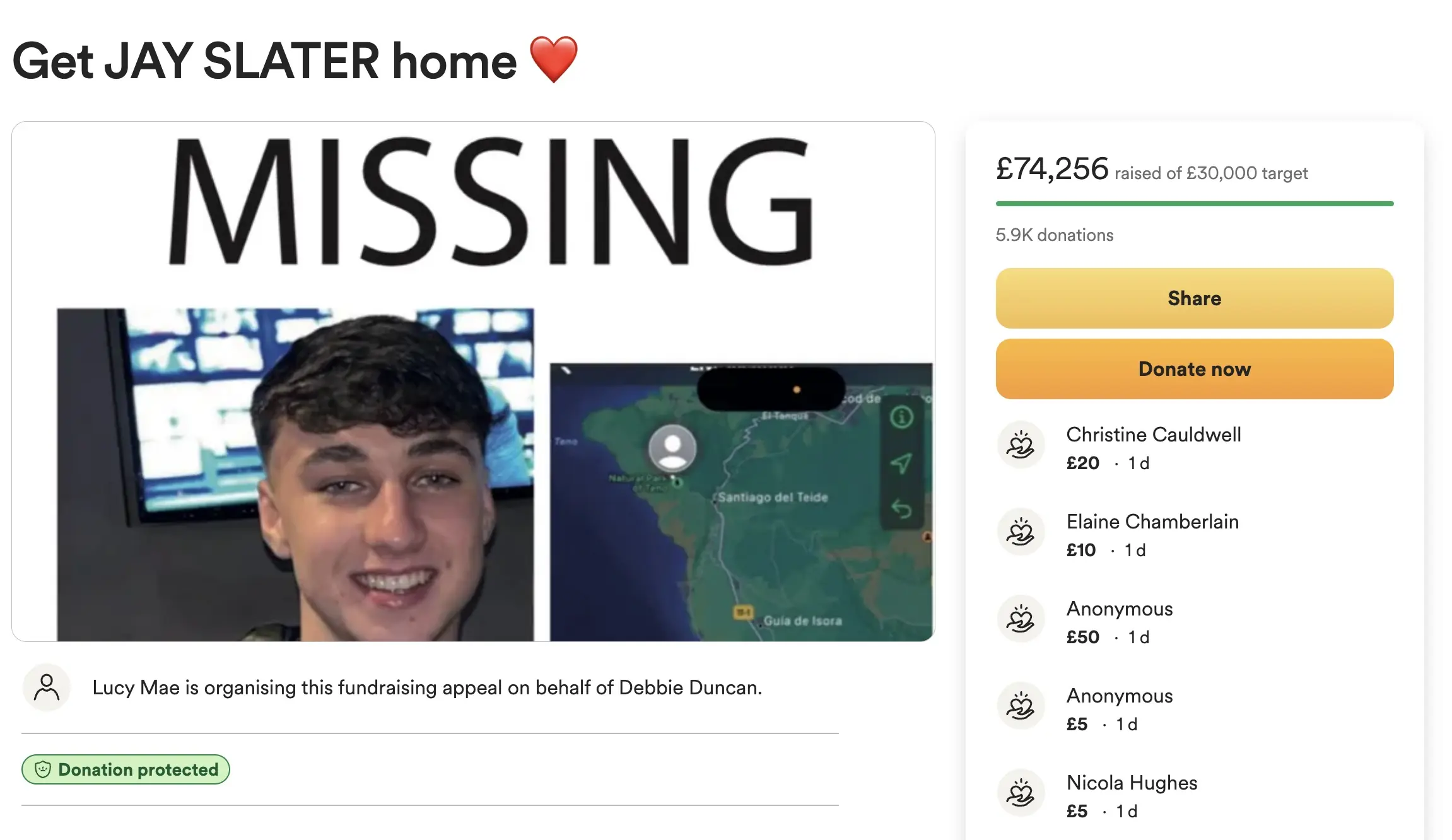 As widely reported, donations from kind supporters have been flooding in on GoFundMe - with the money raised being used to not only help locate Jay, but also support his family while they were in Tenerife, and now - sadly - contribute to his funeral. As of this writing, more than £74,000 has been raised on GoFundMe.