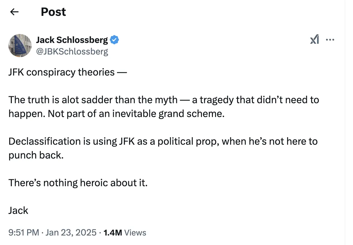 "Declassification is using JFK as a political prop, when he’s not here to punch back. There’s nothing heroic about it," he added, signing the post off with "Jack".