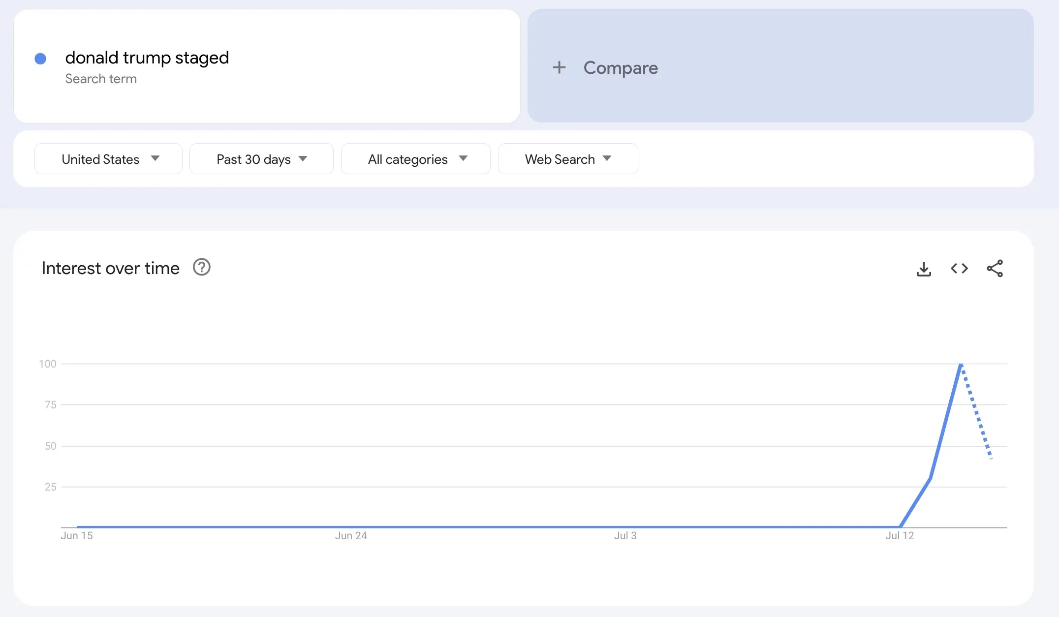 And on Google, searches for 'Donald Trump Staged' have skyrocketed in the last two days, with more and more people using the platform to search for terms like "staged shooting" and "Donald Trump fake".