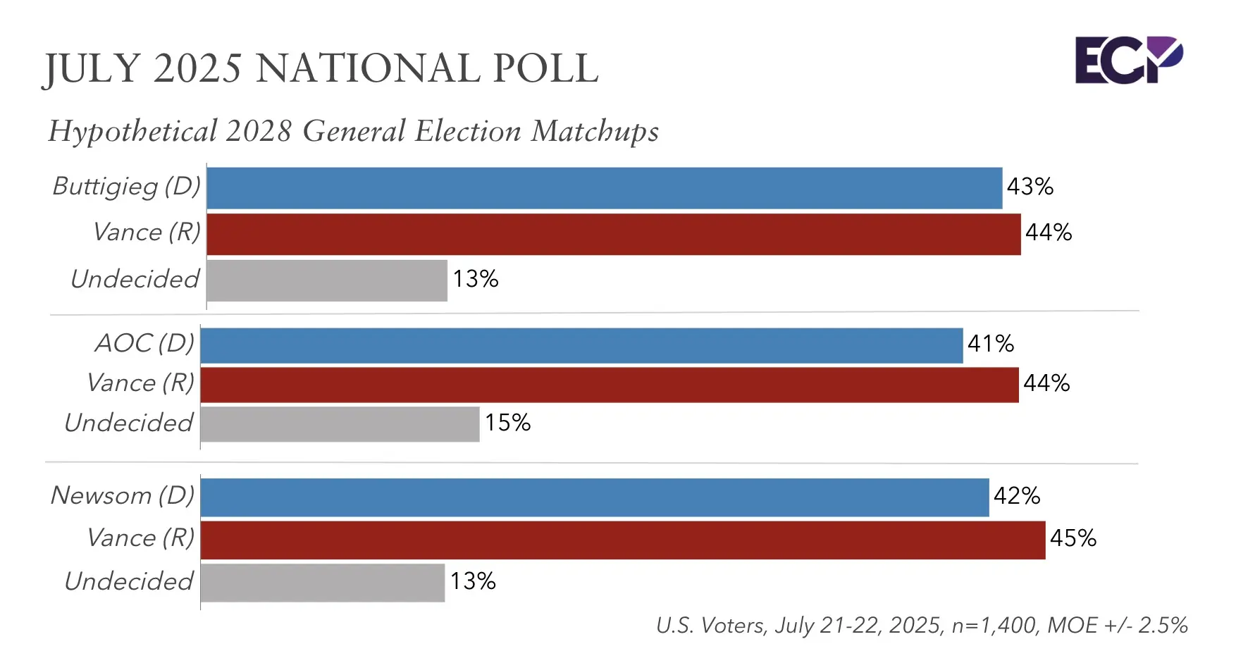 In a hypothetical matchup with Buttigieg, Vance holds a narrow edge with 44% of support to Buttigieg’s 43%, while 13% of voters remain undecided.