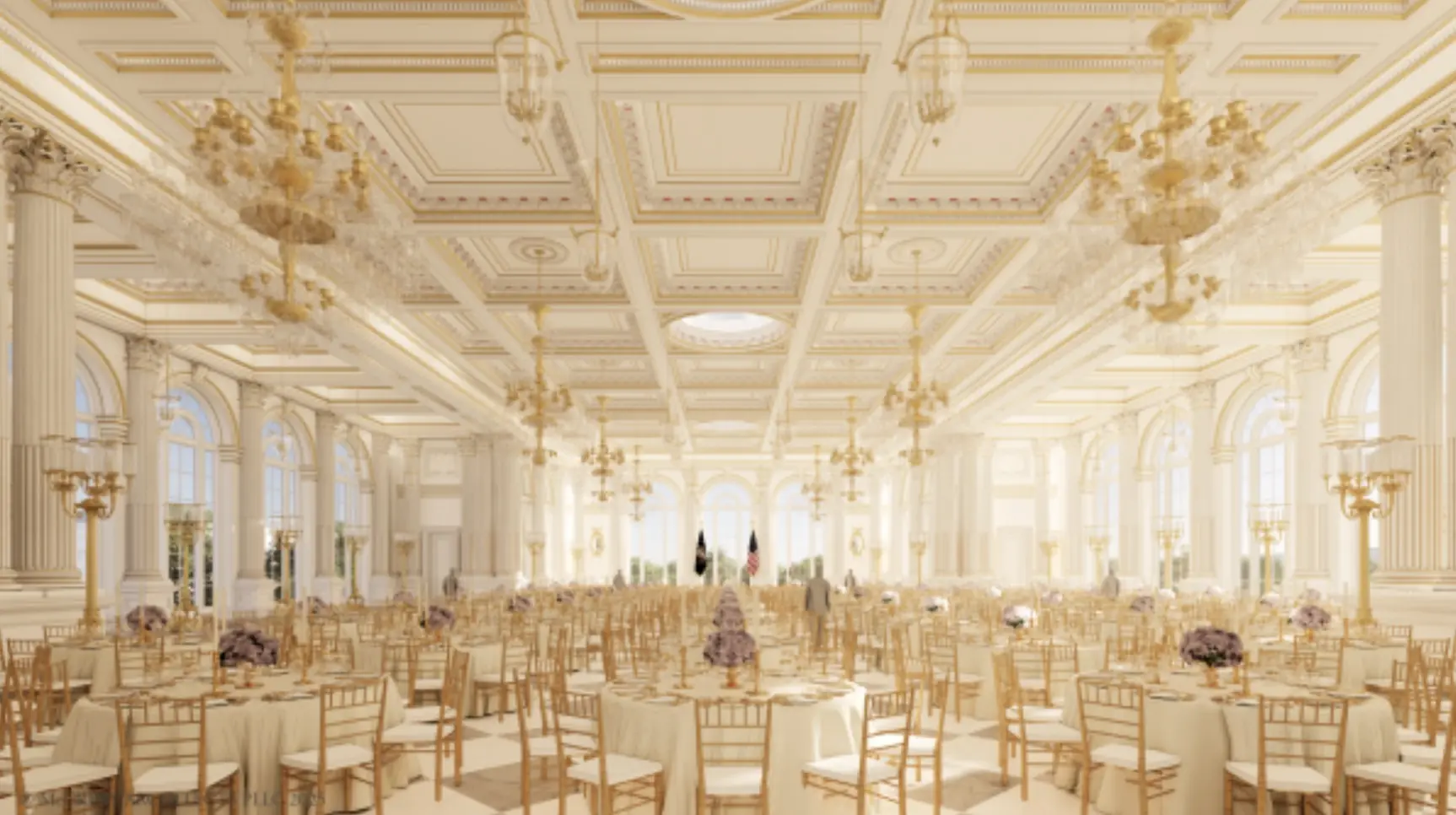 Design renderings released by the White House show a cavernous event hall bathed in gold and crystal. Ornate chandeliers, gilded Corinthian columns, coffered ceilings, and checkerboard marble floors all draw direct inspiration from Trump’s Mar-a-Lago estate. The style mimics Louis XIV architecture and sharply contrasts the more subdued elegance typically associated with presidential venues.