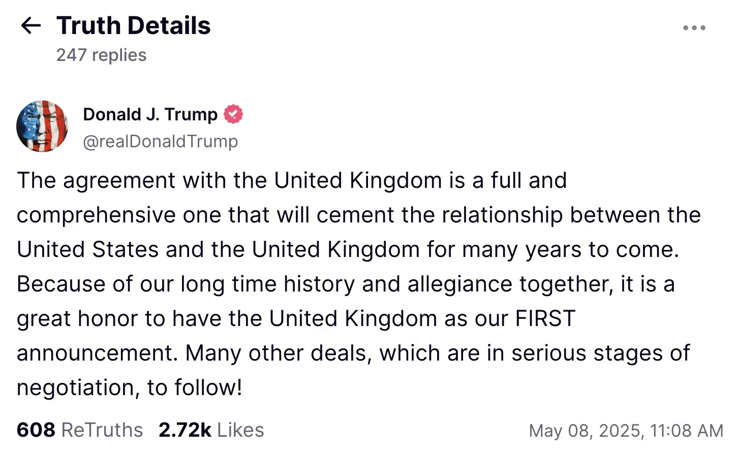 While Trump has billed the UK deal as broad and transformative, analysts and officials have suggested it may be more modest in scope. According to reports from Reuters and The Times, the agreement — set to be formally unveiled during a 10:00AM press conference in the Oval Office (3:00PM UK time) — is expected to focus primarily on lowering tariffs on British steel and cars, not the sort of wide-ranging economic partnership seen in recent deals such as the UK-India agreement.