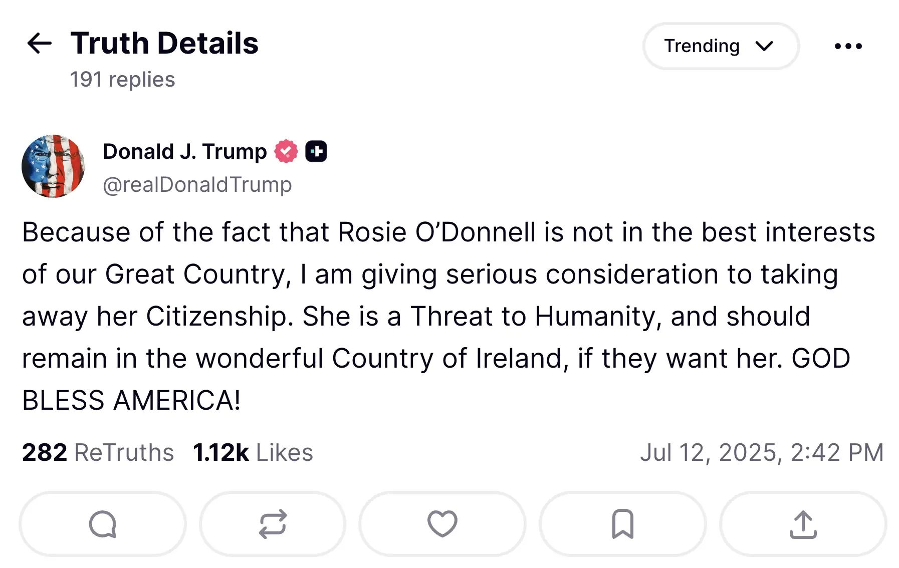 Trump, 79, wrote: "Because of the fact that Rosie O’Donnell is not in the best interests of our Great Country, I am giving serious consideration to taking away her Citizenship. She is a Threat to Humanity, and should remain in the wonderful Country of Ireland, if they want her. GOD BLESS AMERICA!"