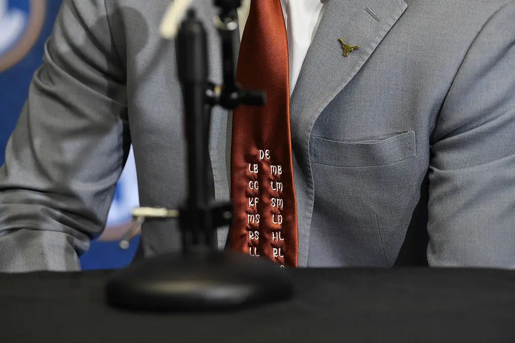 The Texas Longhorns’ redshirt senior safety walked into SEC Media Days in Atlanta wearing a sharp blue suit and a burnt orange tie — but it wasn’t the color that caught attention. Down the length of the tie, in delicate cream embroidery, were rows of initials. Each one belonged to a life lost.