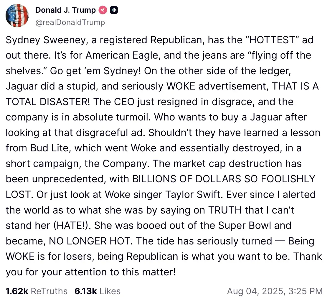 Donald Trump has waded into the growing controversy surrounding actress Sydney Sweeney, launching a full-throated endorsement of her now-viral American Eagle ad campaign while simultaneously attacking Taylor Swift, Jaguar, and “woke” marketing.