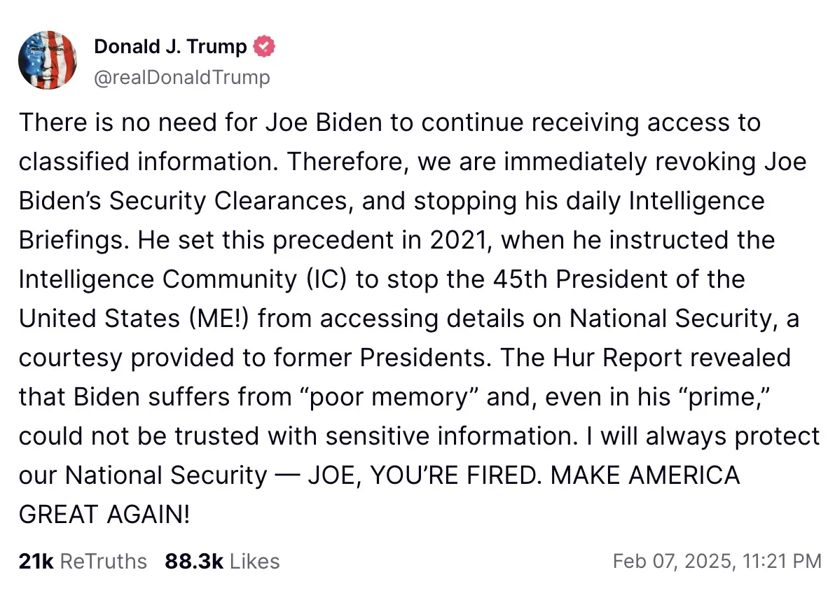 The 78-year-old POTUS announced on Friday (February 7) that he is "immediately revoking" former President Joe Biden’s security clearances and access to daily intelligence briefings, stating that he doesn’t "trust" his predecessor with sensitive national security information.