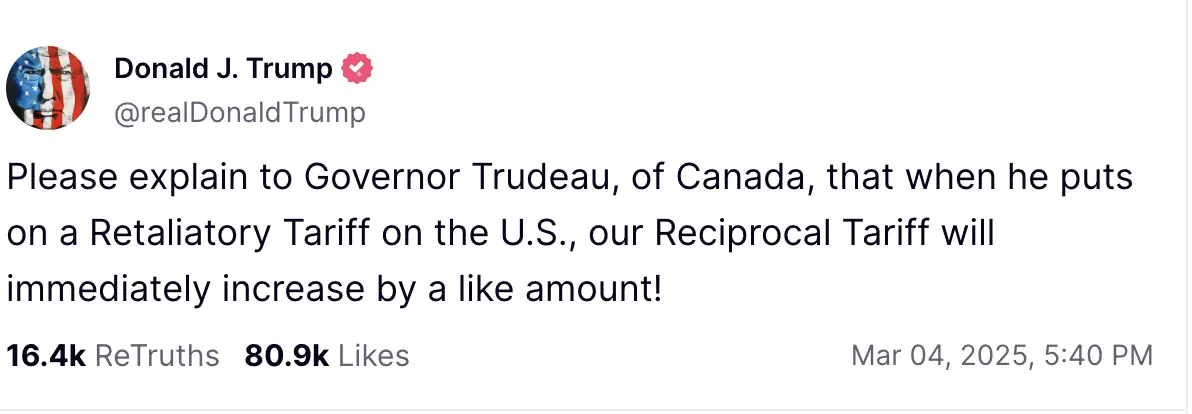 "Please explain to Governor Trudeau, of Canada, that when he puts on a retaliatory tariff on the U.S., our reciprocal tariff will immediately increase by a like amount!" he wrote.